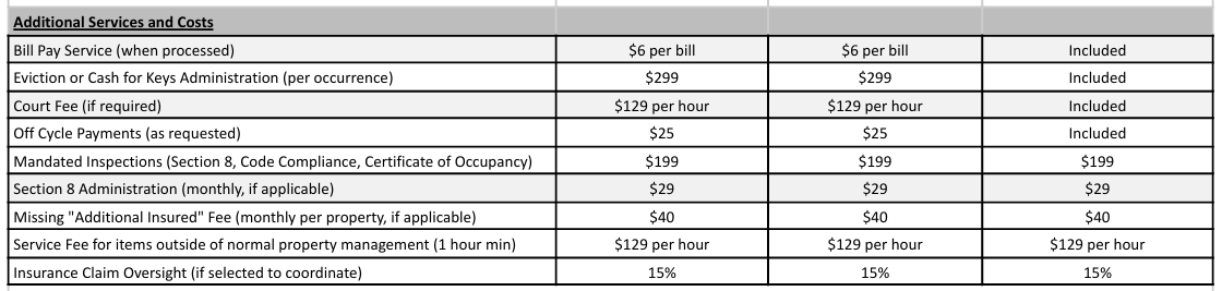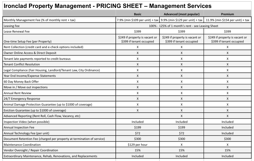 This plan is perfect for an owner who wants complete peace of mind with their income property. Everything from the Advanced Plan is included plus an annual inspection with video at no cost, bill pay service at no cost, eviction or cash for keys administration, court fees, off cycle payments and the annual technology fee.